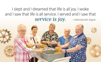 Volunteers set up St. Joseph Hall for funeral luncheons and celebratory occasions: BVMs Joellen McCarthy (l.) and Linda Roby, Associate Marybeth Coleman, and BVMs Ann…