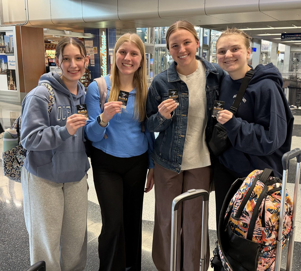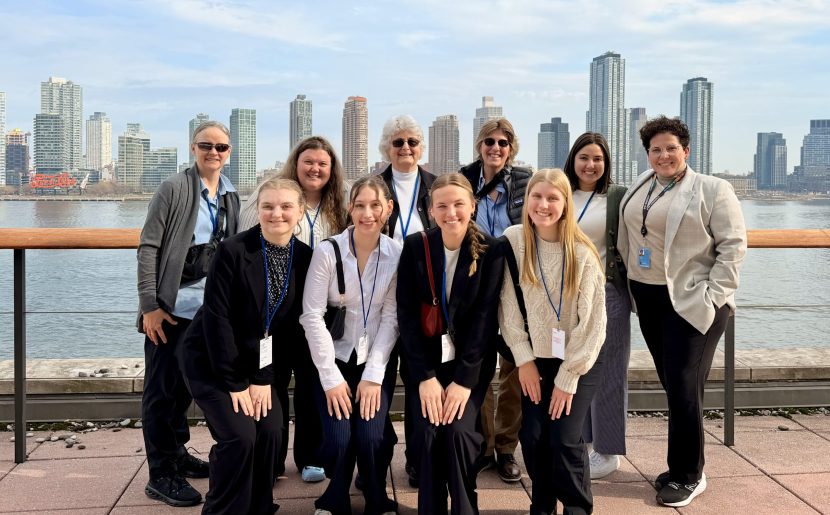 A week in NYC brings new ideas and perspectives to the BVM delegation of Wahlert students Mallory (front row, l.), Lucy, Olivia, and Effie; (back row) Elizabeth Maus, Associates Mariah Reeves and Linda Heying, BVM Pat Bombard, Maggie Winkel, and BVM Katie Anders. Not pictured are delegation members, BVMs Karen Conover and Mary Martens, who attended virtually.