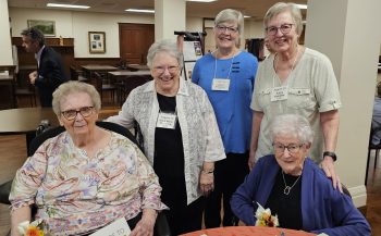 BVMs Letitia Close (l.), Second Vice-President Anne Marie McKenna, President LaDonna Manternach, First Vice-President Kathy Kandefer, and Mary Gene Kinney. During a powerful evening of story, Leadership Conference of Women Religious (LCWR) Region 10 (Iowa, Missouri, and Nebraska) honored the ministry…