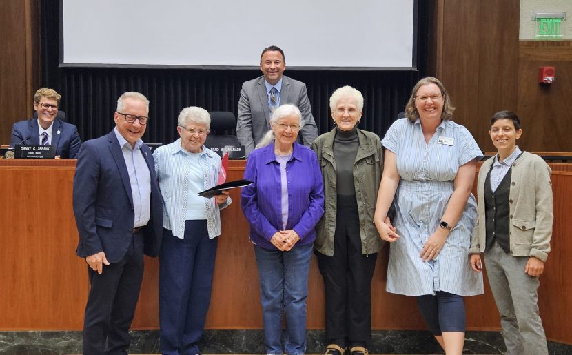 At the City Council Meeting where the proclamation was made were (front row): Franciscan Associate Dave Heiar (l.), BVM Ann DeNicolo, Suzanne Gallagher, PVBM, BVM Associate Nancy McCarville, Dubuque County Reads Program Coordinator Sarah Smith, and Dubuque County Library District Engagement Librarian Lydia Sigwarth. Back row: Councilman Danny Sprank and Mayor Brad Cavanagh.