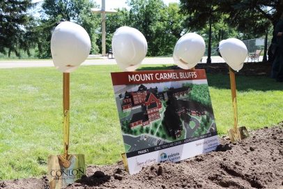 June 13, 2019, Dubuque, IA —“Mount Carmel Bluffs” was unveiled today as the name of the newest senior living community in Dubuque, IA. In a ceremony infused with prayer and history, the Sisters of Charity of the Blessed Virgin Mary (BVM) and Presbyterian Homes & Services (PHS) celebrated the official groundbreaking for Mount Carmel Bluffs, located on the historic Mount Carmel campus, home to BVMs since 1892. The ceremony, held at the Mount Carmel Motherhouse, included local civic and business leaders and neighbors who joined the leadership of BVM and PHS for the event.
