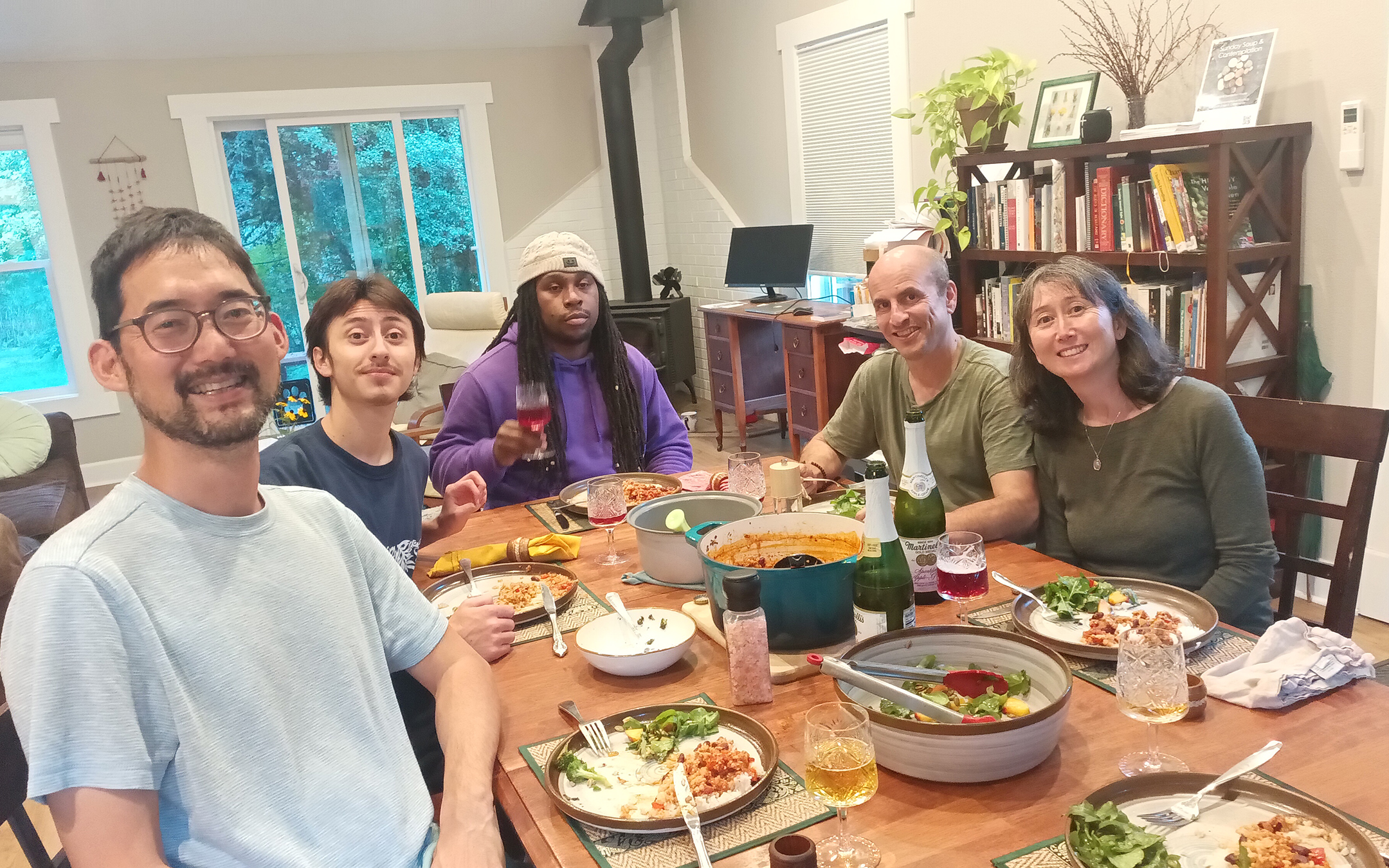 Dandelion House Director Fumi Tosu (l.) enjoys a weekly community meal with Catholic Workers and…