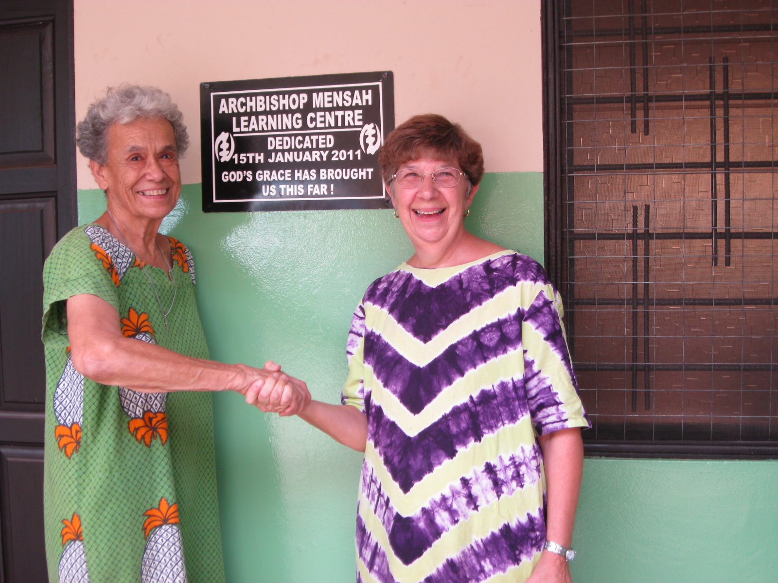 BVM Laurene Brady and Irene Lukefahr celebrate the opening of the Archbishop Mensah Learning Center…